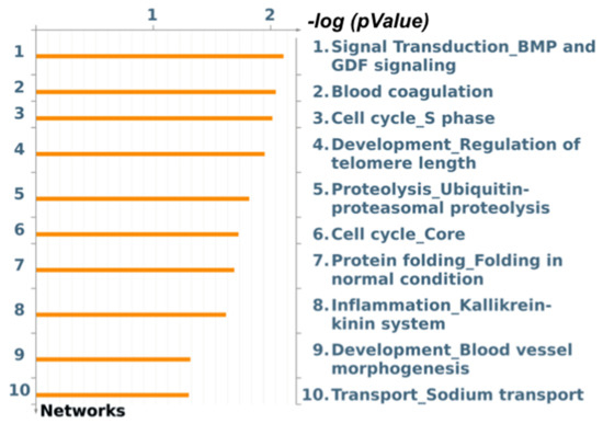 The “protein folding in normal condition” network presents the DEG PPID (+0.48log2 fold change), HSP105 (+0.83log2 fold change), BAG-1 (+0.35log2 fold change), and ST13 (Hip) (−0.35log2 fold change) (Figure S15). The “inflammation_Kallikrein-kinin system” contains the DEG KNG1 (−0.67log2 fold change), which in the gene network appears enriched as a receptor ligand and has bioactive metabolites of bradykinin, as can be seen in Figure S16.