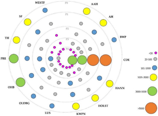 Distribution of horse breeds from the Caballo de Deporte Español Official Stud Book according to the period considered. Different sizes and colors of the circles indicate the number of animals of a certain breed within periods. Where AAH is Anglo-Arab Horse, AH is Arab Horse, BWP is Belgian Warmblood, CDE is Caballo de Deporte Español, HANN is Hanoverian Horse, HOLST is Holsteiner Horse, KWPN is KWPN Horse, LUS is Lusitano Purebred, OLDBG is Oldenburg Horse, OHB is Other Horse Breeds, PRE is Pura Raza Española, TH is Thoroughbred, SF is Selle Français, WESTF is Westphalian Horse; P0 is the period with animals born before 2000, P1 between 2000 and 2004, P2 between 2005 and 2009, P3 between 2010 and 2014, and P4 after 2015.