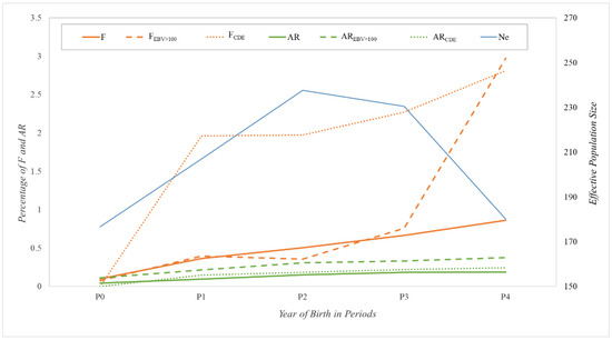 The evolution of the above parameters in all the sets considered and of the Ne computed via individual increase in inbreeding over the five periods analyzed is shown in Figure 2. Considering that in an ideal population with random matings, F would be half the AR, the larger than expected F-values would indicate an important subdivision and/or non-random mating pattern in the population.