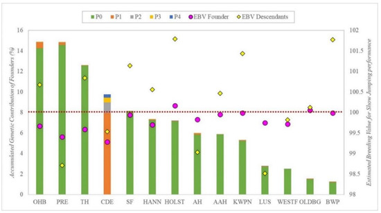 The accumulated genetic contribution of all the founders from the CDE Stud Book, according to the breed group and the period, is represented in Figure 3, also including mean EBV for Show Jumping discipline for each breed’s founders and for their descendants. Breeds are ordered according to their breed founder’s accumulated genetic contribution. Only the results from the Show Jumping discipline were used for this analysis, as more data were available.