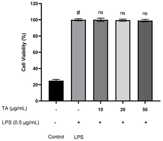 An MTT test was used to determine cell viability [19,22]. The cells were seeded in a 96-well plate, treated with different doses of TA, and then stimulated for 18 h with 0.5 µg/mL LPS. At 37 °C in a humidified atmosphere of 5% CO2, cell culture was carried out in DMEM media supplemented with 10% heat-inactivated FBS and 1% streptomycin/penicillin.