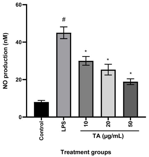 Effect of TA on nitric oxide (NO) production in LPS-stimulated RAW264.7 cells. Each bar is the mean ± s.e.m, n = 3. Cells were incubated in the presence of TA or in the presence of a combination of LPS (0.5 µg/mL) and TA (10, 20, and 50 µg/mL) for 18 h. Data are presented as percentages and LPS control (without TA) was fixed at 100%. # p ≤ 0.05 (control versus LPS treatment); * p ≤ 0.05 (TA treatments versus LPS treatment). One-way ANOVA followed by Dunnett’s post-hoc test. NO (IC50 = 0.067 µg/mL). LPS—lipopolysaccharide.