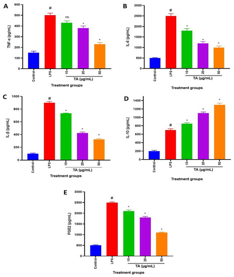 Effects of TA on (A) TNF-α, (B) IL-6, (C) IL-β, (D) IL-10 and (E) PGE2 in LPS-stimulated RAW264.7 cells. The cells were pretreated with increasing concentrations of TA (10, 20, and 50 µg/mL) for 1 h and then exposed to LPS (0.5 µg/mL) for 18 h. The levels of TNF-α, IL-6, IL-β, IL-10 and PGE2 in cell extracts were determined by ELISA. Each bar is the mean ± s.e.m, n = 3. # p ≤ 0.05 (control versus LPS treatment); * p ≤ 0.05, ns p ≥ 0.05 (TA treatments versus LPS treatment). TNF-α (IC50 = 6.39 µg/mL), IL-6 (IC50 = 5.58 µg/mL), IL-1β (IC50 = 5.18 µg/mL), and PGE2 (IC50 = 6.55 µg/mL).