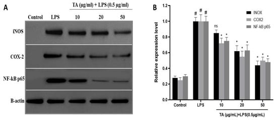 The effect of TA on the expression of iNOS and COX-2 in LPS-induced RAW264.7 cells was investigated. Before adding LPS (0.5 µg/mL), cells were treated with TA (10, 20, or 50 µg/mL) for 1 h. LPS stimulation for 24 and 7 h increased iNOS and COX-2 expression significantly. However, in TA pre-treated cells, this high expression was considerably reduced in a concentration-dependent manner (Figure 4).