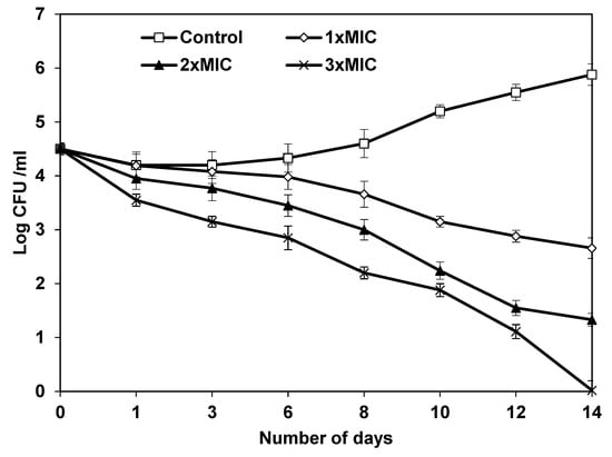 Time-related survival of Listeria monocytogenes at 4 °C following treatment with increasing concentrations of TA. Each plotted point is the mean ± s.e.m, n = 3. Bacteria were supplemented in minced beef meat samples at 6 × 105 CFU/g of meat. MIC—Minimum Inhibitory Concentration; TA—Thiamine.