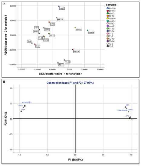 PCA analysis was used to confirm the clustering of the samples. PCA accounted for 97.07% of the variation in the original data (F1: 88.67%, F2: 8.40%) (Figure 6A). It discovered a link between physicochemical (TBARS and pH) and microbiological (PTC, TVC, and Enterobacteriaceae) characteristics, as well as a link between shorter storage duration (0 and 3 days) and higher sensory scores in T1, T2, and BHT samples (Figure 6B). The advancement of microbial contamination and the accumulation of lipid oxidation products in the meat after storage at 4 °C is represented by the arrangement of samples towards the right side of PCA. On days 10 and 14, a strong link between meat deterioration and the control sample was discovered. However, high odor, color, and acceptability scores were directly associated with TA (T1 and T2) treatments even when storage time was increased. As a result, adding TA to minced beef prevents microbiological and physicochemical deterioration while also preserving sensory qualities.