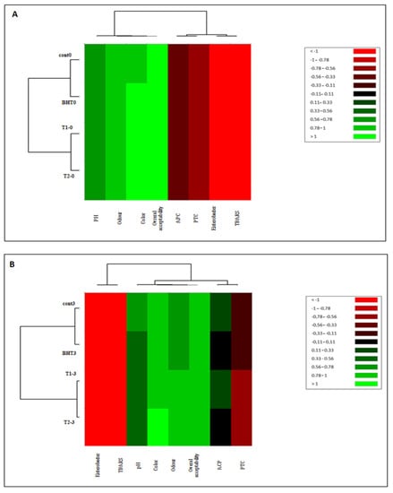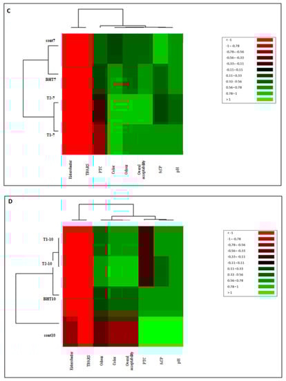 In each day of storage (3, 7, 10, 14 days), heat maps were utilized to summarize the quantitative data of the samples in terms of lipid/protein oxidation, microbial growth, and sensory characteristics (Figure 7). Each parameter has a different color assigned to it, ranging from red for low concentrations to green for high concentrations. On the tenth day of storage, the difference between the different samples was discovered. As a result, the samples are divided into two clusters: clusters (T1 and T2) and cluster T3; (T1, T2 and BHT). Those two clusters contrast with the third, which is represented by the control and is characterized by the most severe microbial contamination, primarily with PTC and APC. These microbiological factors are, in turn, linked to a decrease in beef sensory quality. This shows that the treatments have a protective impact against microbiological, physicochemical, and, as a result, sensory changes in meat over time.