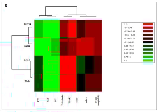 Agglomerative hierarchical cluster analysis (HCA) and heat map of physicochemical characteristics, microbial counts, and sensory attributes of untreated (Control and BHT) and different treated (T1 and T2) samples at each storage time (days): [0 (A); 3 (B); 7 (C); 10 (D) and 14 (E)] days.