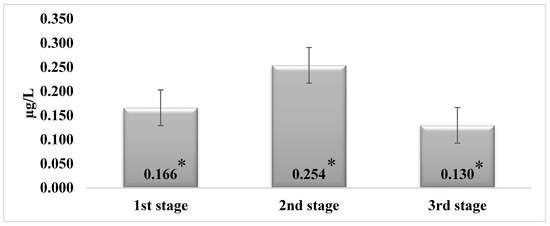 The tested samples of urine also showed variations in the percentage of ZEN metabolites. In these samples, the β-ZAL concentration at the end of the second stage was statistically significant (p < 0.05) compared with the first and the third stages (Table 3). It was determined that the ZAN concentrations in the urine samples at the end of the second stage were 22% higher than at the end of the first stage (p < 0.05). At the end of the third stage, the β-ZEL and α-ZAL concentrations decreased by 11% and 2.8%, respectively, compared with the end of the second stage. The ZAN and β-ZAL concentrations in the urine samples at the end of the third stage were 35% and 39% higher, respectively, than at the end of the second stage.