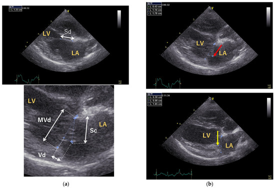 Preoperative and postoperative assessments included measurement of vertebral heart size (VHS) by thoracic radiography and evaluation of the E and A waves, left atrial-to-aortic diameter ratio (LA/Ao), and body weight-normalized end-diastolic left ventricular diameter (LVIDdN) by echocardiography using a 6 or 12 MHz phased-array transducer (Vivid E9; GE Healthcare Co., Ltd., Tokyo, Japan). In addition, the septal leaflet lengths were measured at coaptation (Sc) and end-diastole (Sd) to calculate the coaptation length (CL): CL = Sd−Sc. The CL-index was calculated by dividing CL by the mitral valve short-axis dimension (MVd) at the end-systole. The vertical distance between the annular line and the closing point (Vd) at the end-systole was measured for evaluation of the CT length (Figure 1) [15]. The Vd was measured with the left atrial side set to negative and the left ventricular side set to positive.