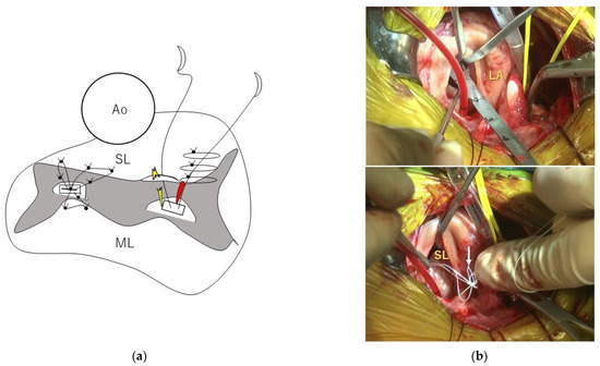 De Vega annuloplasty. (a) Schema of De Vega annuloplasty, in which the annulus is sutured down to the size of the septal leaflet. The mitral annulus, except the base of the septal leaflet, is stitched using CV-5 ePTFE sutures with a purse-string suture through pledgets. If the weight was more than 5 kg, a horizontal mattress suture was added to secure it more rigidly. (b) Intraoperative photos showing the septal leaflet (top). The mitral valve is visualized at the status of mitral valve coaptation by injecting cooled saline solution into the left ventricle to confirm the size of the septal leaflet or the presence of MR (bottom). SL: Septal leaflet; ML: mural leaflet.