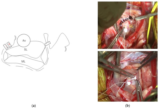 Modified loop technique. (a) Schema of the modified loop technique, in which loops of various lengths are pre-made, sterilized, and used during surgery. Further, 80% of the loops of the strut chordae (red) length were selected to repair ruptured or elongated chordae tendineae (yellow). (b) Using a ruler, the length of the strut chordae (top) was measured. Then, three loops (white arrow), each 80% of the length of the strut chordae, were fixed to the cranial and caudal papillary muscles with a double-armed suture. Of the three loops, two are fixed to the septal leaflet and one to the mural leaflet with simple interrupted sutures (bottom). The loops of the mural leaflet and the center of the septal leaflet are ligated at two points at the valve leaflet. Ao: Aorta; SL: Septal leaflet; ML: mural leaflet; LA: left atrium.