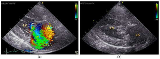 - Morgan, K.R.S.; Monteith, G.; Raheb, S.; Colpitts, M.; Fonfara, S. Echocardiographic parameters for the assessment of congestive heart failure in dogs with myxomatous mitral valve disease and moderate to severe mitral regurgitation. Vet. J. 2020, 263, 105518. [Google Scholar] [CrossRef] [PubMed]