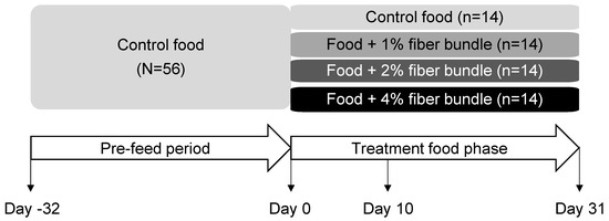 All cats were fed the control food for 32 days and then were divided into four groups of 14 based on their sex, age, and body weight to consume the control food or foods with the fiber bundle added to 1%, 2%, or 4% for 31 days (Figure 1). Feeding each cat the control food in the pre-feed phase prior to the treatment food phase was intended to reduce individual effects in the microbiome analysis. Every cat was fed based on caloric requirements as calculated from body weight. Food was available for 23 h/d. All cats were healthy at the end of the study and were returned to the colony with no adverse events reported.