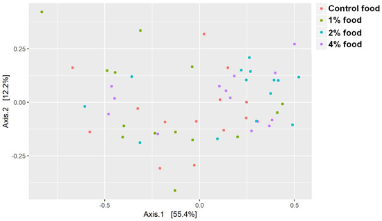 Principal coordinate analysis of the fecal microbiome of cats that consumed foods containing 0% (blue), 1% (red), 2% (green), or 4% (purple) of added fiber-bound polyphenol ingredients for 31 days.