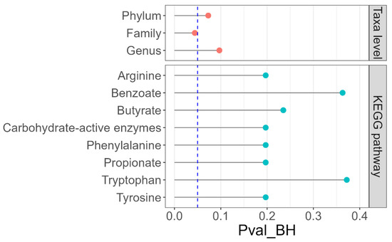 PERMANOVA analyses showing FDR-corrected p values of bacterial taxa (genus, family, and phylum level) and KEGG pathways in feces from cats that consumed the study foods. Vertical dotted line represents p = 0.05. KEGG, Kyoto Encyclopedia of Genes and Genomes; PERMANOVA, permutational multivariate analysis of variance; Pval_BH, p value corrected by the Benjamini–Hochberg method.