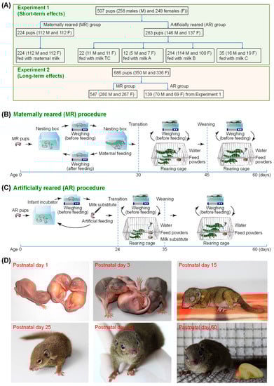 Experimental design and milk feeding procedures in this study. (A) Two experiments were conducted to evaluate the short-term effects (Experiment 1) and the long-term effects (Experiment 2) of milk substitutes on the survival and reproductive performance of the Chinese tree shrews. (B,C) Procedures of milk feeding for the tree shrew pups fed with maternal milk (B) and artificial milks (C) in Experiment 1. A total of 224 pups were included in the maternally reared (MR) group, and 283 pups were included in the artificially reared (AR) groups (milk TC, n = 22; milk A, n = 12; milk B, n = 214; and milk C, n = 35). Objects in (B,C) are not drawn to scale. (D) Photographs of the pups fed with milk B at different ages. On postnatal day 1, pups had smooth, pink skin with eyes closed, and their stomachs are full of milk. On postnatal day 3, pups had black skin due to pigmentation. On postnatal day 15, pups developed a white underbelly and a coat of brownish thick fur. On postnatal day 25, pups were able to move and have their eyes open. On postnatal day 30, pups became active and curious about their surroundings. On postnatal day 60, pups had a similar size and appearance to adults.