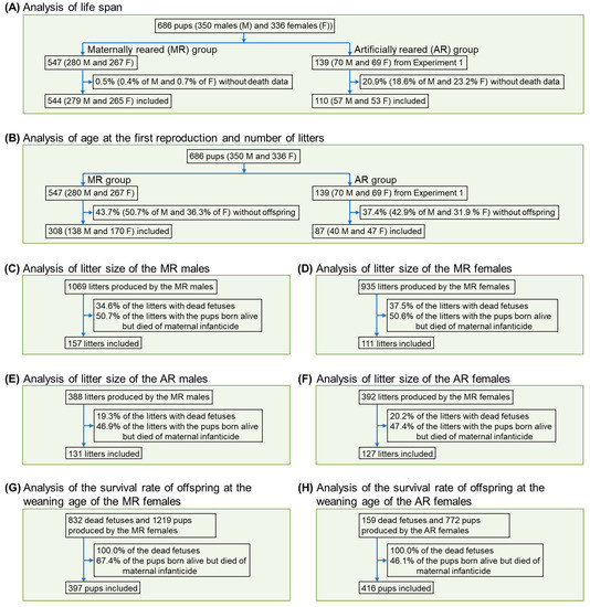 For analysis of the survival rate of offspring at the weaning age, we excluded the dead fetuses and the pups born alive but that died of infanticide at the day of birth (Figure 2G,H). As the values of life span, age at the first reproduction, litter size, and number of litters failed to pass the Shapiro–Wilk test for normal distribution, we used the Mann–Whitney U test to determine the significance for each gender between MR and AR individuals. Since pups in the MR group were only raised by mother tree shrews, the survival rate of offspring at the weaning age between MR and AR groups was analyzed for the mother tree shrews using Fisher’s exact test.
