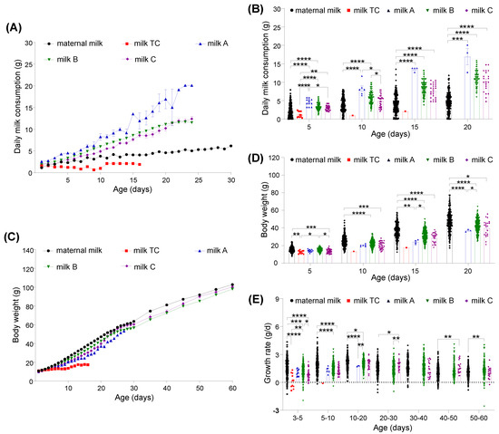 For instance, the pups fed with B milk weighed significantly more (p < 0.05) than the pups fed with milk TC or milk C on postnatal days 5 and the pups fed with milk A on postnatal days 15 and 20 (Figure 3D). When the pups fed with milk B and milk C started to take solid food, they grew quickly to catch up with the MR pups, even with a significantly higher (p < 0.05) growth rate than that of the MR pups (during postnatal days 40–50 for the pups fed with milk C and during postnatal days 50–60 for the pups fed with milk B) (Figure 3E), and the weight difference between the MR pups and the pups fed with milk B progressively narrowed during the growth period (Table 2).