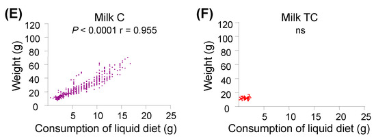 We further performed a correlation analysis to show the increase of body weight and daily milk consumption. We found that the body weights of the MR pups (r = 0.498, p < 0.0001; Figure 4A), the pooled AR pups (r = 0.941, p < 0.0001; Figure 4B), and the AR sub-groups (Figure 4C–E) except for pups fed with milk TC (p = 0.101; Figure 4F), were positively correlated with their daily consumption of milk before introduction of solid food powders. The exact reason why milk TC did not prove as successful as described in the previous report [40] remains to be explored.
