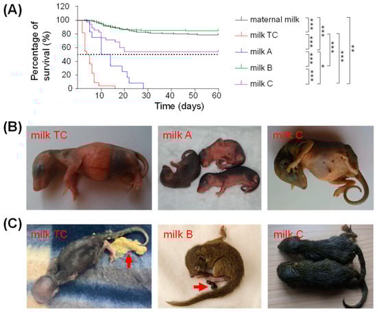 Survival curves and morphology of pups fed with maternal milk and artificial milk. (A) Kaplan–Meier survival curves of pups fed with different milks. Maternal milk, n = 224; milk TC, n = 22; milk A, n = 12; milk B, n = 214; and milk C, n = 35. * p < 0.05, ** p< 0.01, and *** p < 0.001. (B,C) Representative pictures of pups fed with different milk substitutes. (B) On postnatal day 4, pup fed with milk TC was skinny and has gastric food retention; pups fed with milk A had a completely empty stomach before feeding every morning; pups fed with milk C had mild diarrhea. (C) Pup fed with milk TC on postnatal day 13 had diarrhea with liquid, yellow stool (indicated by an arrow) and dehydration. Pup fed with milk B on postnatal day 22 had brown, soft, sausage-shaped feces (see arrow). Pups fed with milk C on postnatal day 18 had severe diarrhea.