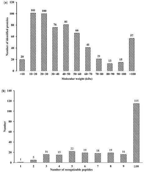 Identification and analysis of salivary proteins during the estrus cycle. (a) Number of peptides with different molecular weights. (b) Number of proteins recognizing different peptides.