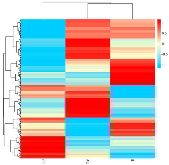 In this study, STEM software (http://www.sb.cs.cmu.edu/stem/ (accessed on 20 September 2021)) was used to cluster the expression data sampled in time sequence and analyze their expression pattern [27]. The function of proteins in each cluster was annotated by using the ClueGO plug-in (v. 2.5.8) in Cytoscape software (v. 3.7.2) to determine the enriched Gene Ontology (GO) terms [28] (p < 0.05). The identified proteins were calculated in terms of the FC and p value through the LFQ value and were screened in accordance with the upregulation of expression multiple ≥ 2 and p < 0.05. The UniProt protein database (www.uniprot.com (accessed on 10 October 2021)) was used for analysis, and three comparison groups were set: E vs. AE, E vs. PE, and AE vs. PE. The screened differential proteins were annotated with GO function and analyzed by the Kyoto Encyclopedia of Genes and Genomes (KEGG) signal pathway to screen the GO function and the KEGG signal pathway enriched by differential proteins, and the string database (http://string.embl.de/ (accessed on 23 October 2021)) in Cytoscape (http://www.cytoscape.org/ (accessed on 10 November 2021)) Software was used for the interaction network analysis of differential proteins [29].