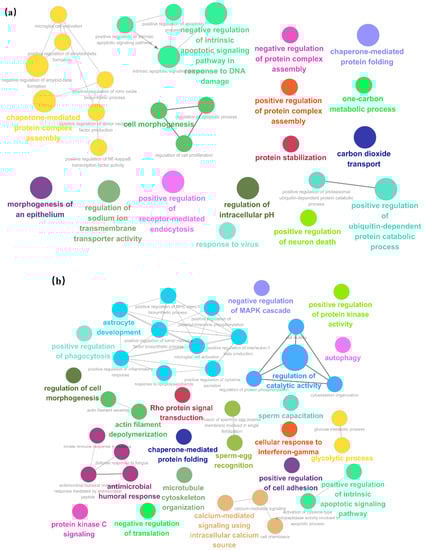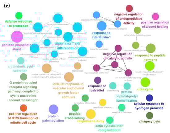 The expression data of the identified proteins were clustered in chronological order, their expression patterns were analyzed, and eight different clusters were determined. The whole protein expression trend was divided into eight groups, which were coded from 0 to 7. Trends 6 and 7 were the significant enrichment trends (p < 0.05, Figure 3a,b). The protein functions in the three trends of E upregulation were annotated by using the ClueGO plug-in (v. 2.5.8) in the Cytoscape software (v. 3.7.2) to determine the enriched GO terms (p < 0.05, Figure 4a–c).