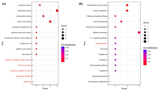 The results of the GO and KEGG enrichment analysis of 40 differentially significant proteins showed that the GO items involved in the significant enrichment were mainly related to biological processes, where the items related to reproduction included the regulation of meiotic nuclear division, female pronucleus, response to peptide hormone, response to estradiol, and oogenesis. (p < 0.05), and KEGG pathway mainly includes oocyte meiosis (p < 0.05). The results are shown in Figure 6 (Supplementary material Tables S1 and S2).
