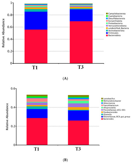 The relative abundance of taxa observed at the phyla and genus levels between the T1 and T3 group are illustrated in Figure 1. When assessing the microbiota composition at the phylum level, we found that Bacteroidota, Firmicutes and Actinobacteriota were the dominant microbes in both groups of individuals. Higher abundance of Bacteroidota (p < 0.05) and lower abundance of Firmicutes (p < 0.05) were observed in the T3 group. Moreover, at the genus level, Bacteroides, and Rikenellaceae_RC9_gut_group were the main genera in both groups. Furthermore, the abundance of Faecalibacterium was decreased (p < 0.05) in the T3 group compared with the T1 group.