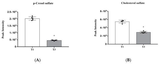 As observed in Figure 2 and Table S2, p-cresol sulfate and cholesterol sulfate were identified as differential metabolites between the T1 and T3 groups. It suggested that AGE supplementation at 0.4% significantly downregulated the levels of p-cresol sulfate and cholesterol sulfate (p < 0.05) compared with the T1 group.