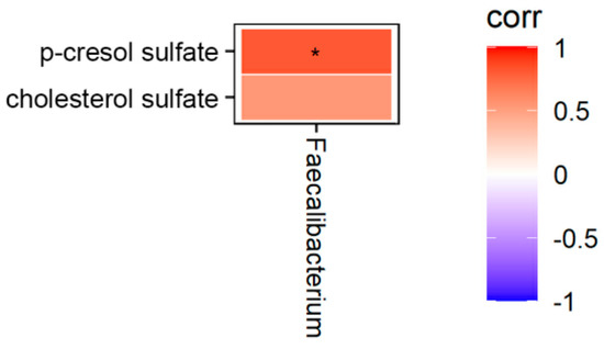 We further analyzed the correlation between metabolites and microbiota in the cecal content between the T1 and T3 groups (Figure 3). The result showed that the level of p-cresol sulfate positively correlated with Faecalibacterium (p < 0.05).