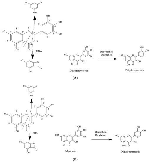 The proposed fragmentation pathways of dihydromyricetin are shown in Figure 4A. The metabolite M1 was identified with an accurate [M−H] ion at m/z 303.0406, which was 16 Da less than that of the parent compound, implying the dehydration and reduction in dihydromyricetin. The MS2 fragmentation generated the fragment ions at m/z 125.0246, 151.0034, 181.0159 and 285.0560. The ion at m/z 285.0560 was produced by the loss of a water molecule, and the product ion at m/z 151.0034 was generated because of the RDA (Retro Diels-Alder reaction) fragmentation. The bond cleavage between C4−C10 and C2−O1 produced the product ions at m/z 125.0243 and 177.0192.