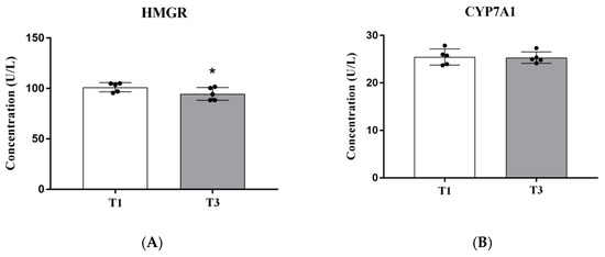 The liver is the main site of fat metabolism in poultry. To further explore the effects of treatment with AGE on lipid metabolism in broilers, we mainly analyzed the levels of the key hepatic fat metabolism synthase HMGR and CYP7A1 between the T1 group and the T3 group (Figure 5). The hepatic HMGR enzyme activity in the T3 group was lower (p < 0.05) than the T1 group.