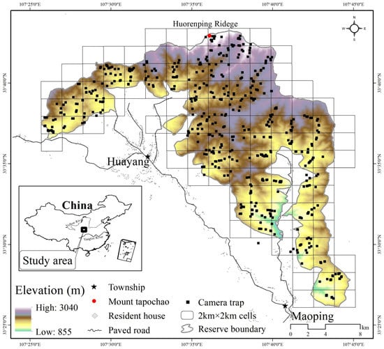Changqing National Nature Reserve (Changqing reserve, 107°25′ to 107°45′ E, 33°26′ to 33°43′ N) is located on the southern slopes of the Qinling Mountains in central China (Figure 1). Changqing reserve was established in 1994, added to the IUCN green list of protected areas in 2014, and further upgraded to a national park in 2017. The reserve covers an area of approximately 299 km2, with elevations ranging from 800 m (Maoping) to 3040 m (Huorenping Ridege). The average annual temperature is 7 °C and the average annual rainfall is 814 mm. Based on the local climate characteristics, we divided the year into warm season (April–October) and cold season (November–March) [45]. Vegetation varies with elevation: deciduous broadleaf forest is mainly found at lower elevations, mixed broadleaf-conifer forest is found at mid-elevations, and coniferous forest interspersed with subalpine shrubs and meadows is found at higher elevations. The reserve provided protection to the giant panda (Ailuropoda melanoleuca), golden monkey (Rhinopithecus roxellana), and other endangered species [46]. Of all the mammal species present, 2 were evaluated as Endangered by IUCN RedList, 6 as Vulnerable and 4 as Near Threatened [42,47].