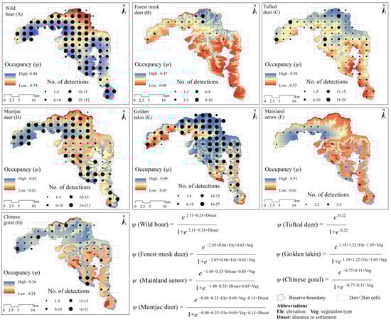 Spatial projection of ungulates occupancy probability (ψ) and model structure in Changqing reserve, based on the average top models (∆AIC ≤ 2). (A)—wild boar, (B)—forest musk deer, (C)—tufted deer, (D)—muntjac deer, (E)—golden takin, (F)—mainland serow, (G)—Chinese goral. Black points show the center of each 2 km × 2 km cell, and their size indicates the total number of independent camera detections.