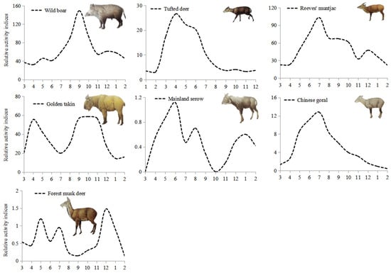 The Qinling Mountains of central China are a biodiversity hotspot and a wildlife-rich area in the world [41]. The area harbors seven wild ungulates, including forest musk deer (Moschus berezovskii), which are listed as Endangered by the IUCN red list; golden takin (Budorcas taxicolor bedfordi), Chinese goral (Naemorhedus griseus), and mainland serow (Capricornis milneedwardsii), which are listed as Vulnerable; tufted deer (Elaphodus cephalophus) listed as Near Threatened, as well as reeves muntjac (Muntiacus reevesi) and wild boar (Sus scrofa). Currently, wild ungulate populations in the Qinling Mountains are mostly a successful conservation story [42], as their numbers and distribution ranges have increased substantially, resulting in stiff interspecific competition, especially in places where top predators are virtually absent, with the common leopard (Panthera pardus) recorded only once in the study area. Given this predisposition to interspecific competition, the spatial segregation and temporal avoidance may be at least partially due to behavioral mechanisms, allowing for coexistence among these sympatric wild ungulates with particular interest. However, the activity patterns of the species in this region are completely unknown due to difficulty in accessing the locations where they occur [43].