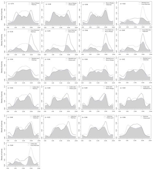 Forest musk deer had moderate temporal overlaps with other five wild ungulate species (0.5 < Δ ≤ 0.75; Table 4), and forest musk deer and wild boar had the lowest temporal overlaps (Δ = 0.54). Temporal overlaps among wild boar, tufted deer, reeves muntjac, golden takin, mainland serow and Chinese goral were relatively high (all pairwise Δ > 0.75), and that among tufted deer and reeves muntjac (Δ = 0.9), and reeves muntjac and Chinese goral (Δ = 0.9) had the highest temporal overlaps (Figure 4).