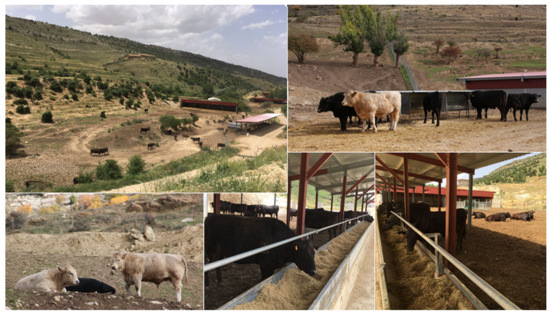 The farm is located in north-central Spain. Cows and cow–calf pairs were housed in a separate barn for the breeding herd, and calves stayed with their mothers (with 20 m2/cow of available shadowed surface) until weaning at 3 to 5 months of age. Male calves were routinely castrated by the veterinarian staff of the farm during the first two weeks following birth. Weaned calves were housed in growing barns (10 m2/animal) in groups of 14 to 18 animals/pen, up to the age of 22 months. During the last phase of fattening (>22 months of age until slaughter), steers were kept in groups of 10 animals/pen (20 m2/animal). All barns were open (natural ventilation), with anti-slip, concrete or soil floors and chopped straw bedding (Figure 1).