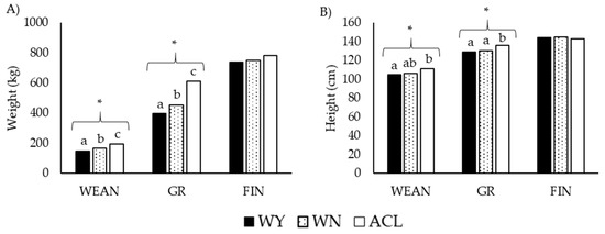 The weights and heights were higher for ACL animals than for the other groups, especially at WEAN and GR. However, the values were similar among the three groups at FIN. At SL, the Wagyu and Wangus animals showed similar weights and heights.