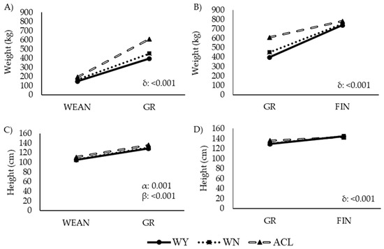 Changes in (A,B) weight and (C,D) height of steers during two intervals within the fattening period. Abbreviations: ACL: crossbred animals Angus-by-Charolais or Angus-by-Limousin; WEAN to GR: weaning to growing interval; GR to FIN: growing to finishing interval; WN: Wangus animals (Wagyu-by-Angus) breed; WY: fullblood Wagyu animals. α indicates significant effect by breed; β indicates significant effect by time; δ indicates significant effect by the interaction between breed and time. Parameters are expressed as median values.