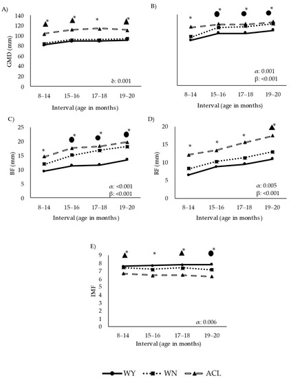 Longitudinal approach of ultrasound estimates of fat and muscle deposition over time in steers during the fattening period. Abbreviations: Panel (A): GMD, depth of the gluteus medius muscle measured at point “P8” rump site; Panel (B): REA, ribeye area of the longissimus dorsi measured between the 12–13th ribs; Panel (C): BF, back fat thickness measured between the 12–13th ribs; Panel (D) RF, rump fat thickness at the “P8” rump site; Panel (E): IMF, intramuscular fat estimation (numerical values provided by the software); ACL, crossbred Angus-by-Charolais or Angus-by-Limousin; WN, Wangus animals (Wagyu-by-Angus) breed; WY, fullblood Wagyu animals. One asterisk indicates that all breeds differed significantly from one another (p < 0.001). ●* indicates that the breed WY differed significantly from the other two (p < 0.001). ▲* indicates that the breed ACL differed significantly from the other two (p < 0.001). α indicates significant effect of breed; β indicates significant effect of time; δ indicates significant effect of the interaction between breed and time. Parameters are expressed as median values.