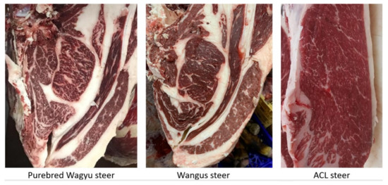 In vivo evaluated intramuscular fat, the most important characteristic for the high value of Wagyu beef, was similar in the Wangus and Wagyu animals, and higher than that of the ACL steers. The IMF assures the high price and extra quality of this kind of beef [45], compensating for the higher cost of the long fattening period [45]. Further studies should examine how the differences that we found correlate with the market value of beef from different animal breeds.