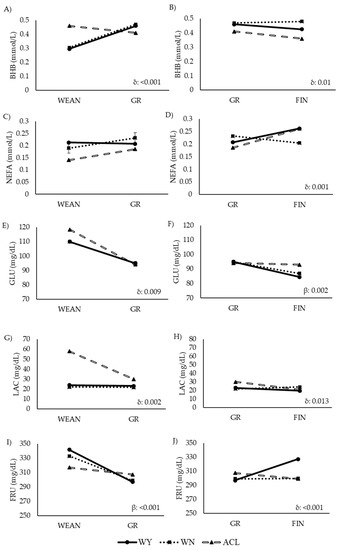 Comparison of levels of energy-related metabolites in steers at two time points during the fattening period (longitudinal approach). Abbreviations: ACL: crossbred animals Angus-by-Charolais or Angus-by-Limousin; BHB: β-hydroxybutyrate: Panels (A,B); FIN: finishing period; FRU: fructosamine: Panesl (I,J); GLU: glucose: Panels (E,F); GR: growing period; LAC: lactate: Panels (G,H); NEFA: non-esterified fatty acid: Panels (C,D); WEAN: after weaning; WN: Wangus animals (Wagyu-by-Angus); WY: fullblood Wagyu animals. Parameters are expressed with median values. β indicates significant effect of time; δ indicates significant effect of the interaction between breed and time.