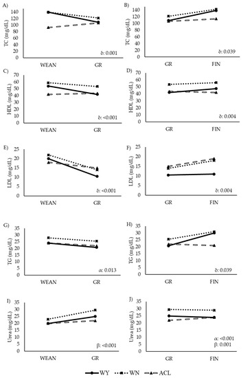 From WEAN to GR, LDL decreased in all three groups (Figure 7E), while TC and HDL decreased in the WY and WN animals but increased in the ACL steers (Figure 7A,C). However, from GR to FIN, TC, HDL, and TG increased in the WY and WN animals (Figure 7A,D,H). Urea did not change significantly over time in any breed from WEAN to GR, but it changed significantly from GR to FIN, with a slight increase only in the ACL steers.