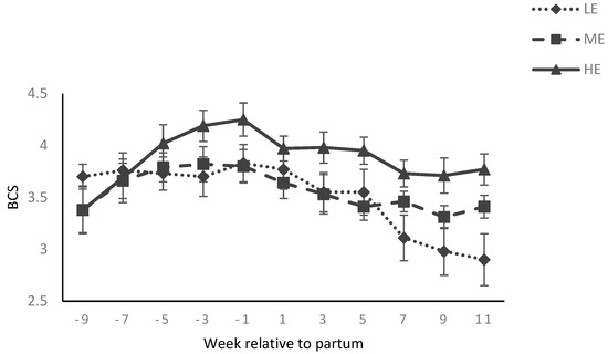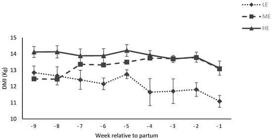 Dry matter intake (DMI) in the 9 weeks prepartum was affected by diet (12.2 vs. 13.4 vs. 13.8 ± 0.23 for the LE, ME or HE diet, respectively) (p < 0.01) and tended to be affected by week (p = 0.06, Figure 1).