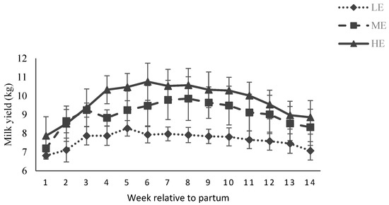 Figure 2. Milk yield (kg/d) of Nili Ravi buffaloes fed a low energy (LE), medium energy (ME) or high energy (HE) level during 9 weeks prepartum. Low, medium, and high energy levels were NEL: 1.30, 1.42, and 1.53 Mcal/kg, respectively, on DM basis in dietary treatments. Values represent LS means ± SEM.