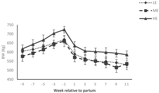 Figure 4. Body weight (BW; kg) of Nili Ravi buffaloes fed a low energy (LE), medium energy (ME) or high energy (HE) level during 9 weeks prepartum. Low, medium, and high energy levels were NEL: 1.30, 1.42, and 1.53 Mcal/kg, respectively, on DM basis in dietary treatments. Values represent LS means ± SEM.
