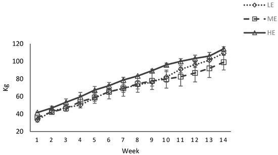 Figure 5. Body weight (BW; kg) of Nili Ravi buffalo calves fed a low energy (LE), medium energy (ME) or high energy (HE) level during 9 weeks prepartum. Low, medium, and high energy levels were NEL: 1.30, 1.42, and 1.53 Mcal/kg, respectively, on DM basis in dietary treatments. Values represent LS means ± SEM.