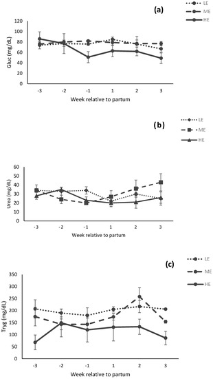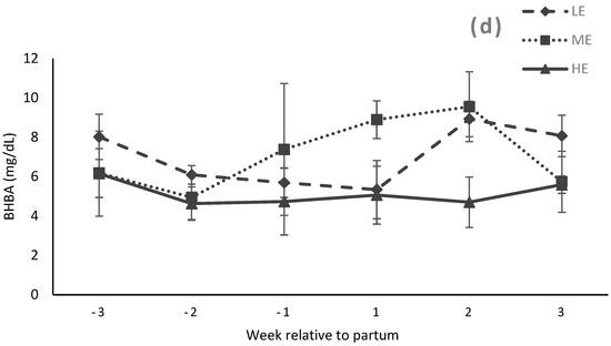 Prepartum, serum metabolites were not affected by diet (Table 4). Postpartum, serum glucose tended to be affected (p = 0.10) and triglycerides were lower (p < 0.05) for buffaloes fed the HE diet compared with buffaloes fed the ME or LE diet (Figure 6). The serum concentration of BHBA was affected by week × diets (p < 0.05) and it was lower in HE diet compared with LE or ME diet during postpartum (Figure 6d).